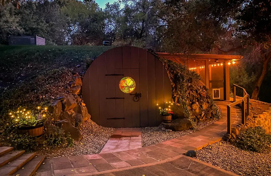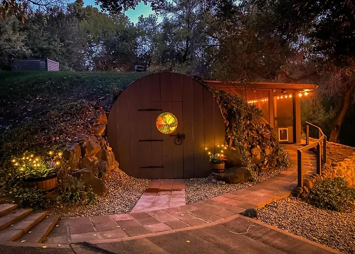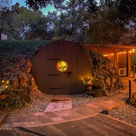 Situated 4.1 miles from Immaculate Conception Catholic Church, Myrinn-Hobbit Cottage On The Creek Storybook Stay Page Springs invites guests to relax at a patio.